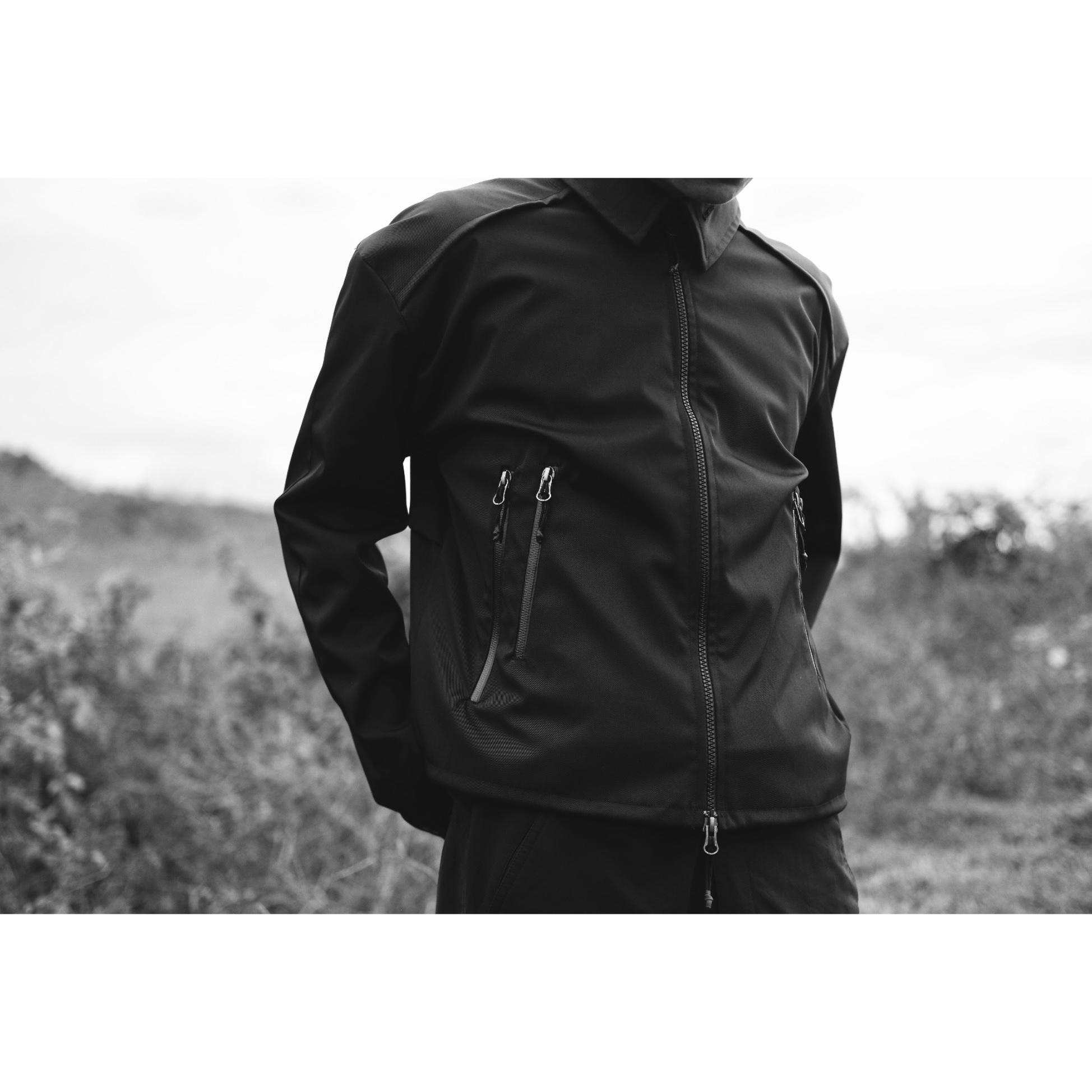 The Index Jacket features multi waterproof pocket construction and a boxy silhouette, accented with seasonal cut detailing. Features a windproof, 2-way YKK zipper, waist adjust strap, and stand collar structured fit. Crafted from a 2-layer twill stretch coated water-repellent 250 GSM with a cotton fiber lining for a refined finish.